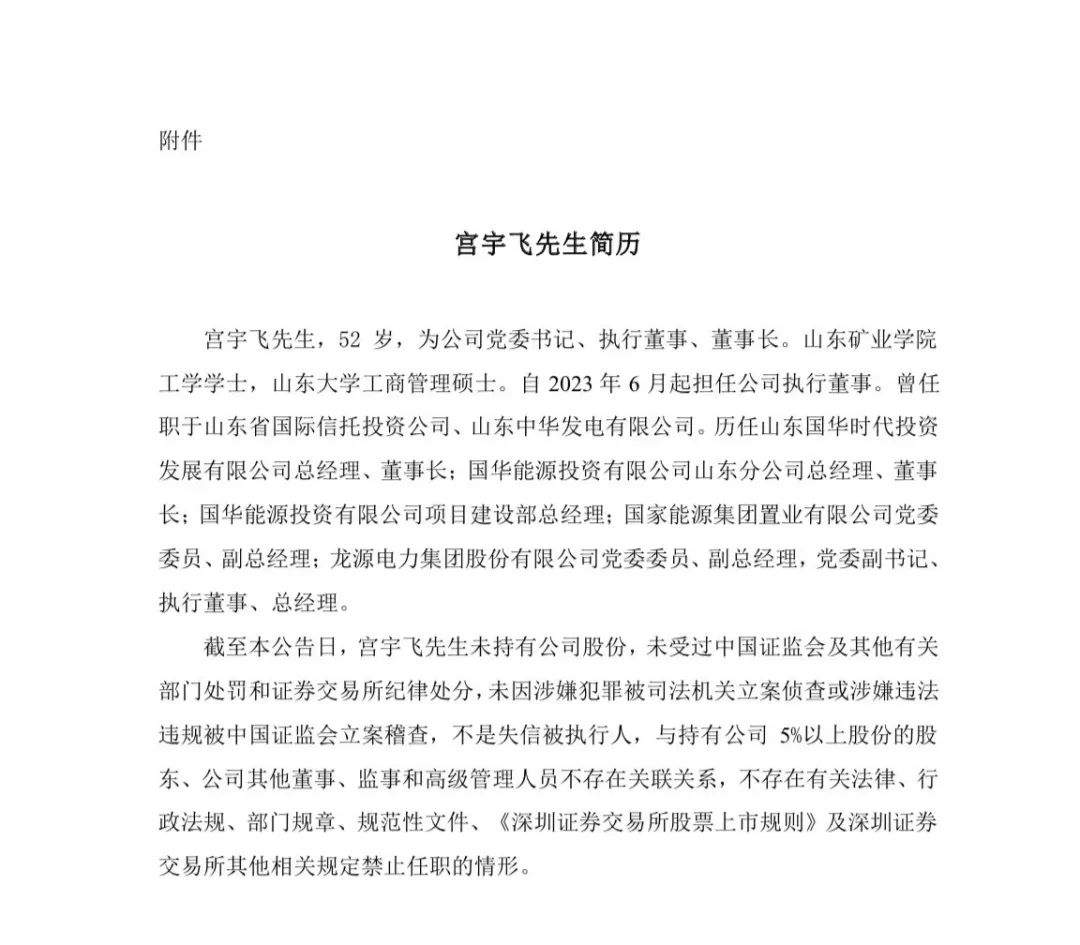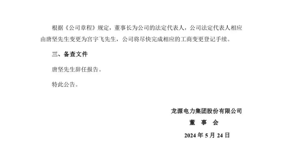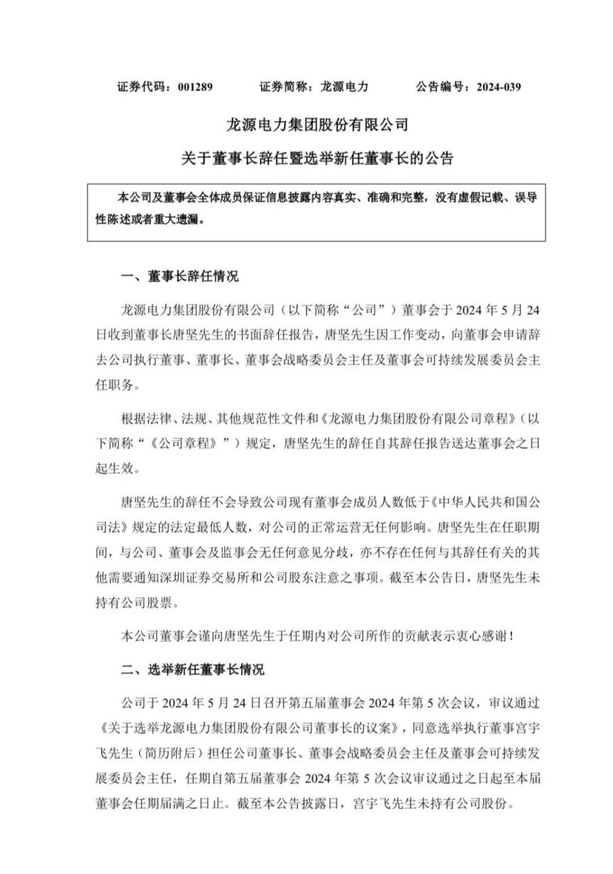 5月24日,龙源电力发布《对于董事长辞任暨选举新任董事长的公告》。公告称,公司董事会于5月24日收到董事长唐坚先生的书面辞任解说,唐坚先生因责任变动,向董事会央求辞去公司实施董事、董事长、董事会战术委员会主任及董事会可捏续发展委员会主任职务。