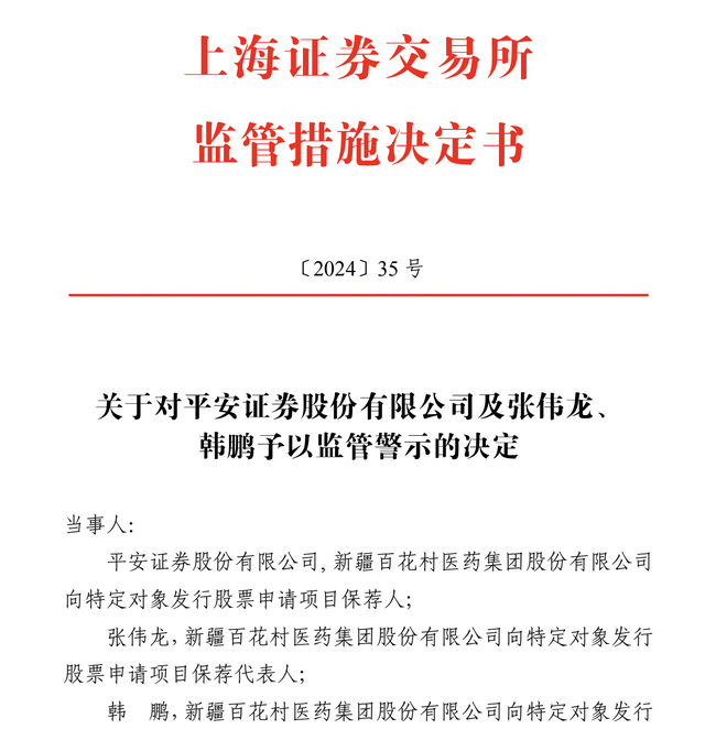 6月12日,上海证券走动所(简称“上交所”)更新两份监管措施决定书。因保荐职责实行不到位,在百花医药非公设立行股票刊行上市进程中,存在实控东谈主变更未实时讲述及浮现等违章情形,吉祥证券及保荐代表东谈观念伟(金麒麟分析师)龙、韩鹏,百花医药被弃取监管警示措施。