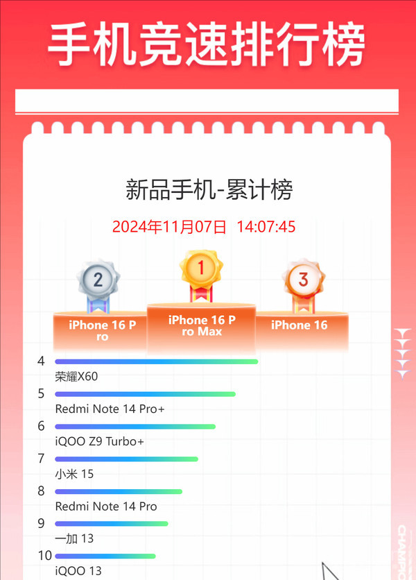 而从11月7日确当日榜(通常松手14点)来看,前三名的机型莫得变化,iPhone 16 Pro升至第一,小米15和一加13则升至第四和第五。此外,华为nova 13、OPPO Find X8和荣耀Magic7 Pro等机型也榜上闻明。